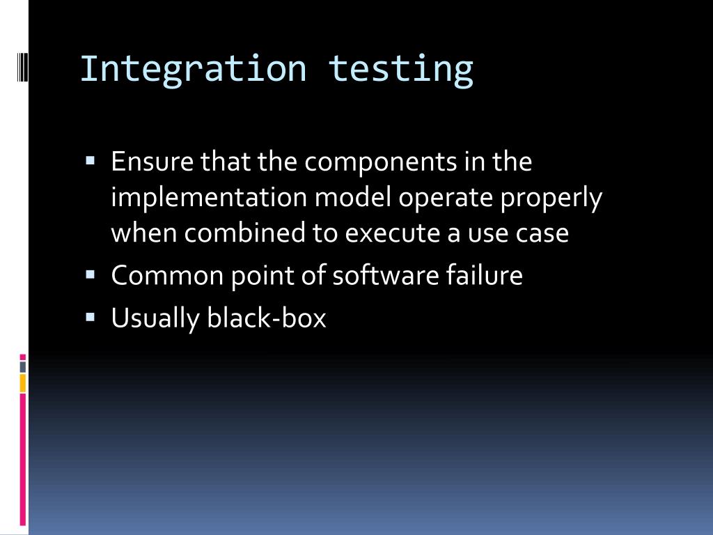 Integration testing • Ensure that the components in the implementation model operate properly when combined to execute a use case • Common point of software failure • Usually black-box