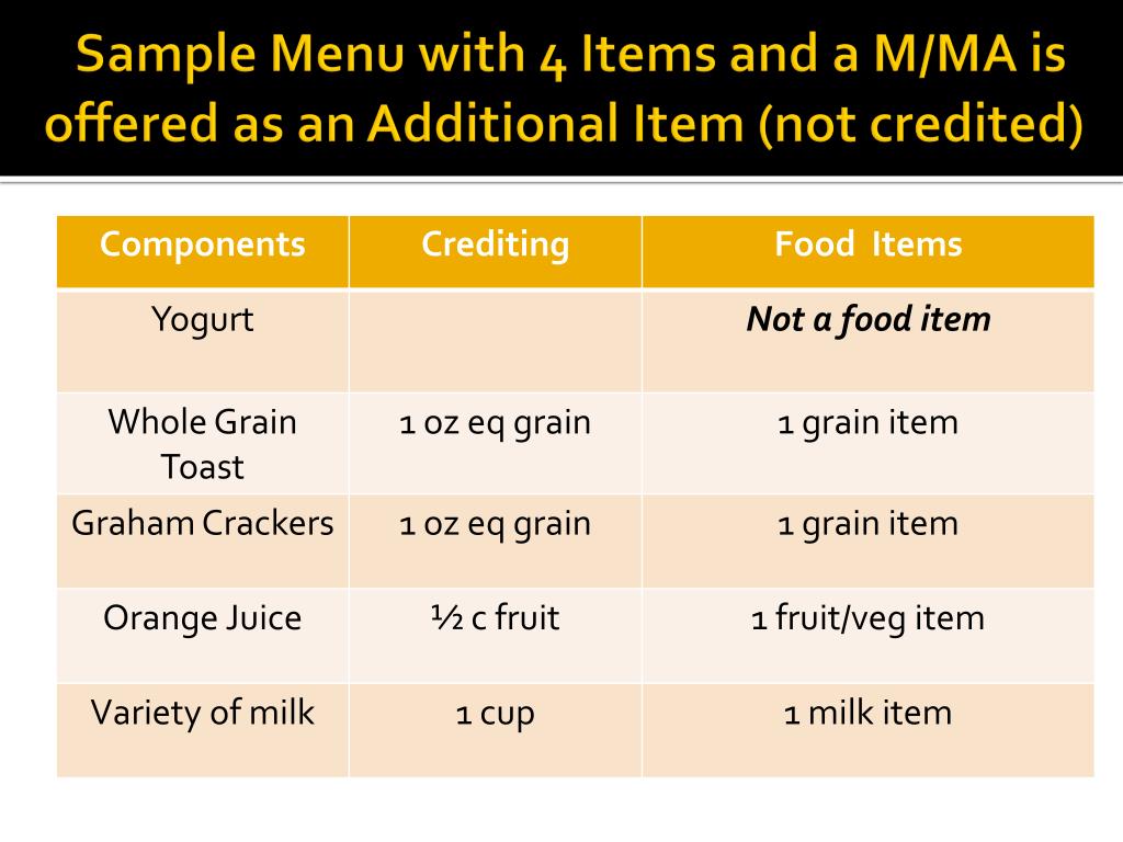 Sample Menu with 4 Items and a M/MA is Credited as a Grain Item