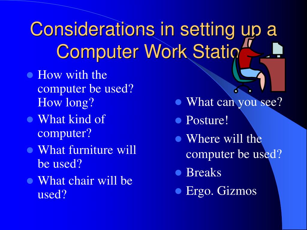 How with the computer be used? How long? What kind of computer? What furniture will be used? What chair will be used? What can you see? Posture! Where will the computer be used? Breaks Ergo. Gizmos Considerations in setting up a Computer Work Station