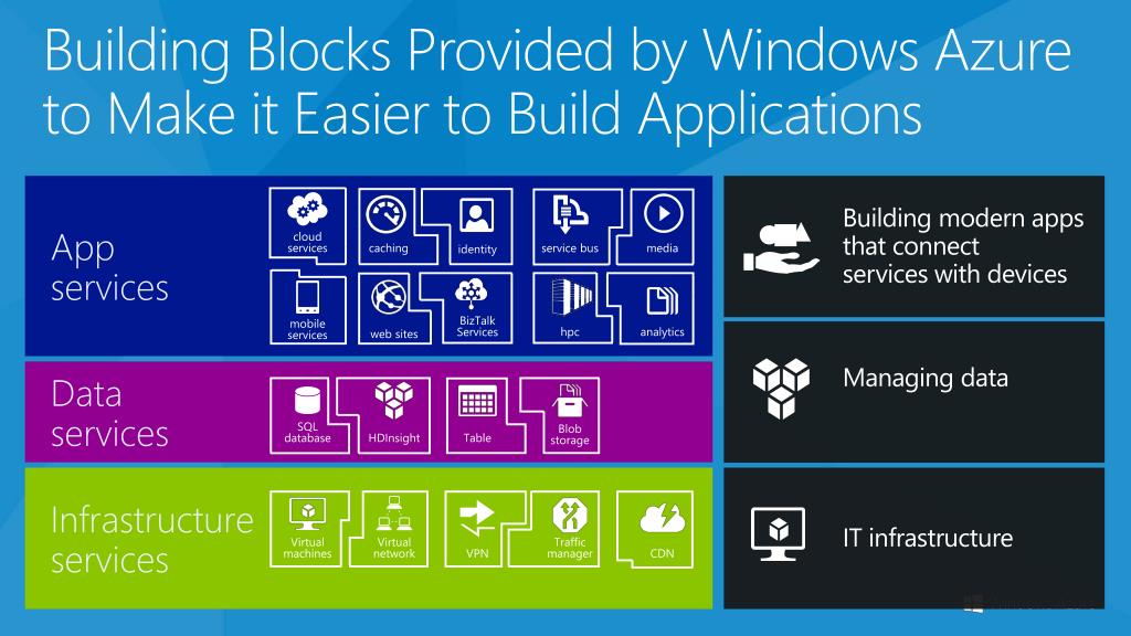 Building Blocks Provided by Windows Azure to Make it Easier to Build Applications App services cloud services caching service bus media identity • Building modern apps that connect services with devices hpc analytics BizTalk Services web sites mobile services • Managing data Data services SQL database HDInsight Table Blob storage Infrastructure services • IT infrastructure Virtual machines Virtual network VPN Traffic manager CDN