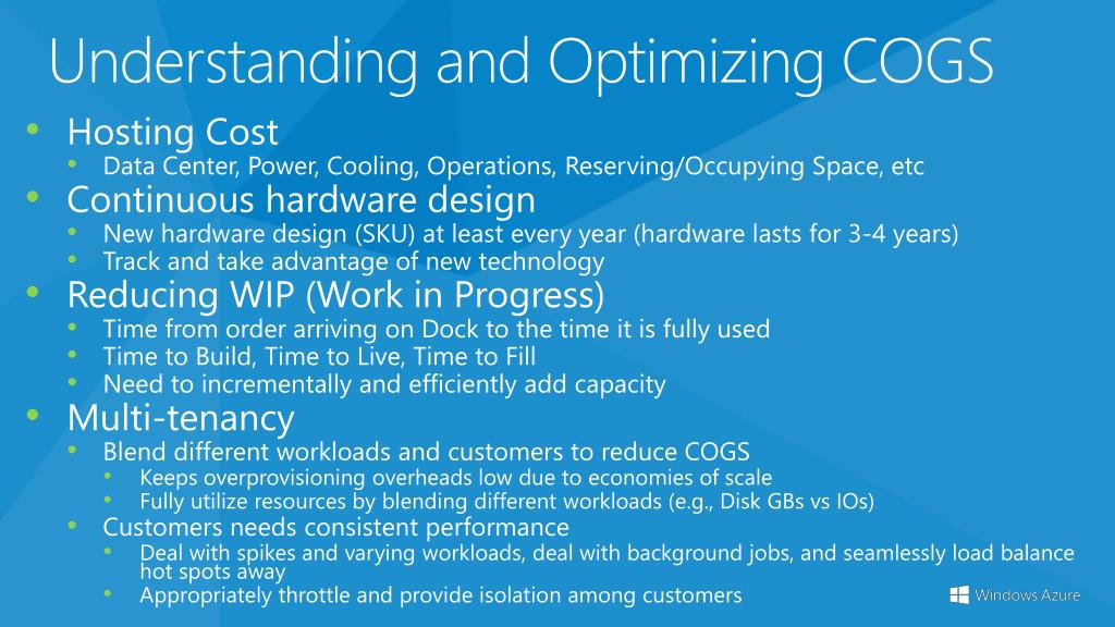 Understanding and Optimizing COGS • Hosting Cost • Data Center, Power, Cooling, Operations, Reserving/Occupying Space, etc • Continuous hardware design • New hardware design (SKU) at least every year (hardware lasts for 3-4 years) • Track and take advantage of new technology • Reducing WIP (Work in Progress) • Time from order arriving on Dock to the time it is fully used • Time to Build, Time to Live, Time to Fill • Need to incrementally and efficiently add capacity • Multi-tenancy • Blend different workloads and customers to reduce COGS • Keeps overprovisioning overheads low due to economies of scale • Fully utilize resources by blending different workloads (e.g., Disk GBs vs IOs) • Customers needs consistent performance • Deal with spikes and varying workloads, deal with background jobs, and seamlessly load balance hot spots away • Appropriately throttle and provide isolation among customers