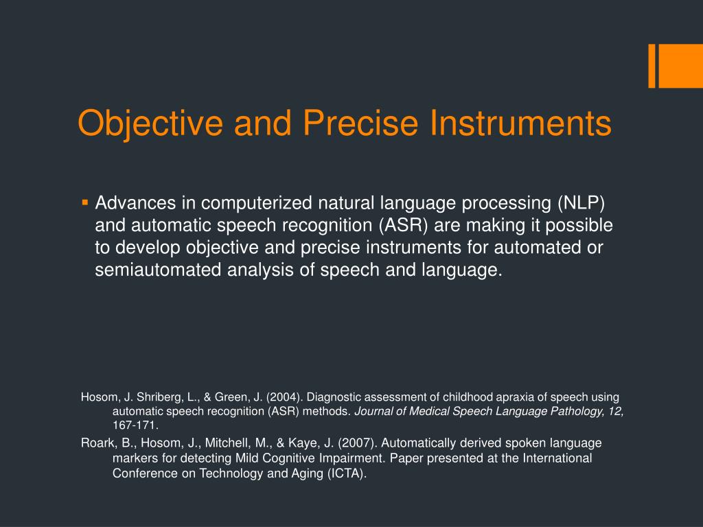 Objective and Precise Instruments • Advances in computerized natural language processing (NLP) and automatic speech recognition (ASR) are making it possible to develop objective and precise instruments for automated or semiautomated analysis of speech and language. Hosom, J. Shriberg, L., & Green, J. (2004). Diagnostic assessment of childhood apraxia of speech using automatic speech recognition (ASR) methods. Journal of Medical Speech Language Pathology, 12, 167-171. Roark, B., Hosom, J., Mitchell, M., & Kaye, J. (2007). Automatically derived spoken language markers for detecting Mild Cognitive Impairment. Paper presented at the International Conference on Technology and Aging (ICTA).