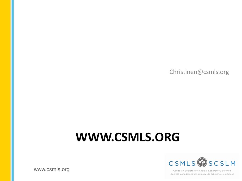 The Canadian Society for Medical Laboratory Science (CSMLS) is a national Not-for-profit association, Certifying body for Medical Laboratory Technologists (MLT) and Medical Laboratory Assistants (MLA), and Professional society for Canada’s medical laboratory professionals Established in 1937 Represents 14,500 members in Canada and abroad CSMLS: Who We Are