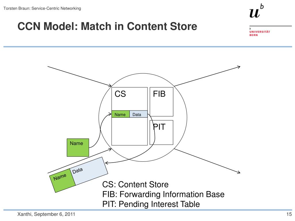 Torsten Braun: Service-Centric Networking CCN Model: Match in Pending Interest Table Name CS FIB PIT x CS: Content Store FIB: Forwarding Information Base PIT: Pending Interest Table