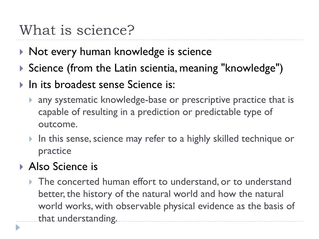 What is science? • Not every human knowledge is science • Science (from the Latin scientia, meaning "knowledge") • In its broadest sense Science is: • any systematic knowledge-base or prescriptive practice that is capable of resulting in a prediction or predictable type of outcome. • In this sense, science may refer to a highly skilled technique or practice • Also Science is • The concerted human effort to understand, or to understand better, the history of the natural world and how the natural world works, with observable physical evidence as the basis of that understanding.