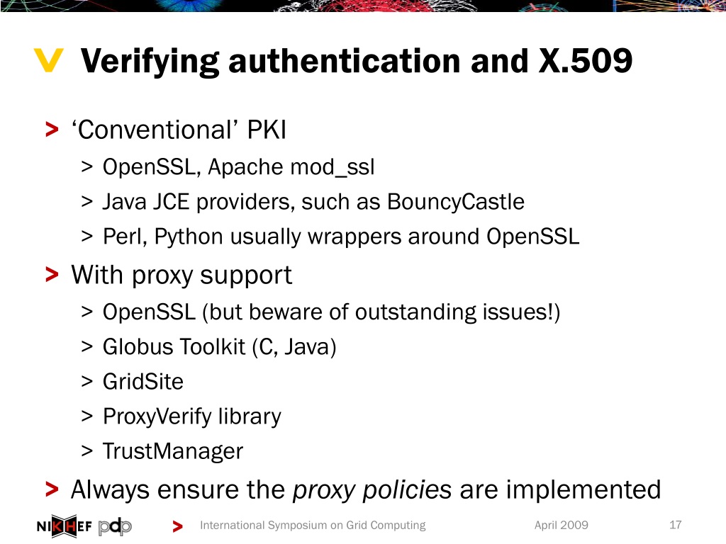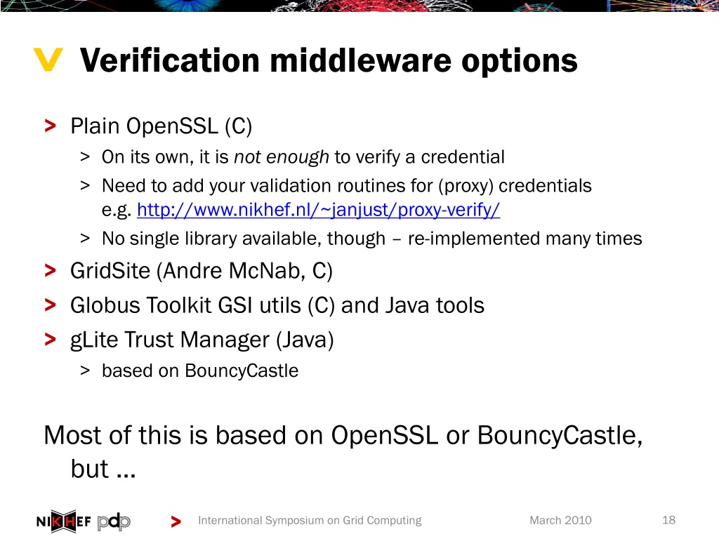 Verification middleware options • Plain OpenSSL (C) • On its own, it is not enough to verify a credential • Need to add your validation routines for (proxy) credentialse.g. http://www.nikhef.nl/~janjust/proxy-verify/ • No single library available, though – re-implemented many times • GridSite (Andre McNab, C) • Globus Toolkit GSI utils (C) and Java tools • gLite Trust Manager (Java) • based on BouncyCastle Most of this is based on OpenSSL or BouncyCastle, but … International Symposium on Grid Computing