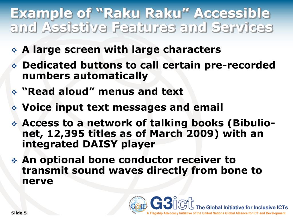 Example of “RakuRaku” Accessible and Assistive Features and Services A large screen with large characters Dedicated buttons to call certain pre-recorded numbers automatically “Read aloud” menus and text Voice input text messages and email Access to a network of talking books (Bibulio-net, 12,395 titles as of March 2009) with an integrated DAISY player An optional bone conductor receiver to transmit sound waves directly from bone to nerve