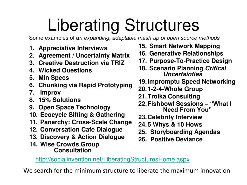 Appreciative Interviews Agreement / Uncertainty Matrix Creative Destruction via TRIZ Wicked Questions Min Specs Chunking via Rapid Prototyping Improv 15% Solutions Open Space Technology Ecocycle Sifting & Gathering Panarchy: Cross-Scale Change Conversation Café Dialogue Discovery & Action Dialogue Wise Crowds Group Consultation 15. Smart Network Mapping 16. Generative Relationships 17. Purpose-To-Practice Design 18. Scenario Planning Critical Uncertainties 19. Impromptu Speed Networking 20. 1-2-4-Whole Group 21. Troika Consulting 22. Fishbowl Sessions – “What I Need From You” 23. Celebrity Interview 24. 5 Whys & 10 Hows 25. Storyboarding Agendas 26. Positive Deviance Liberating StructuresSome examples of an expanding, adaptable mash-up of open source methods http://socialinvention.net/LiberatingStructuresHome.aspx We search for the minimum structure to liberate the maximum innovation