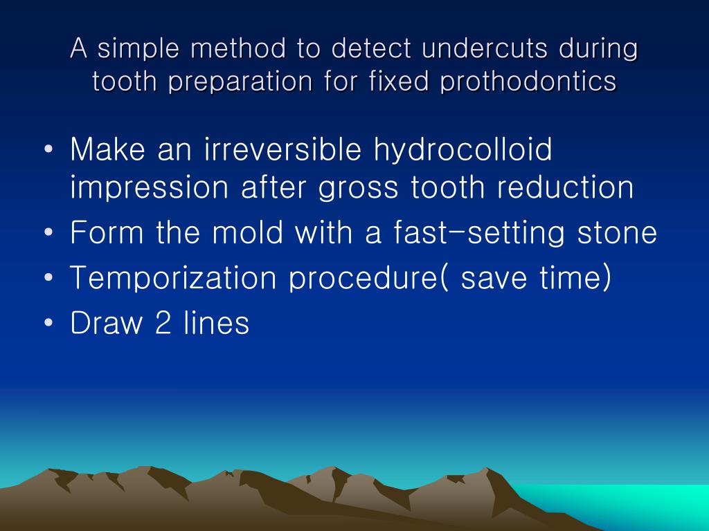 A simple method to detect undercuts during tooth preparation for fixed prothodontics • Make an irreversible hydrocolloid impression after gross tooth reduction • Form the mold with a fast-setting stone • Temporization procedure( save time) • Draw 2 lines