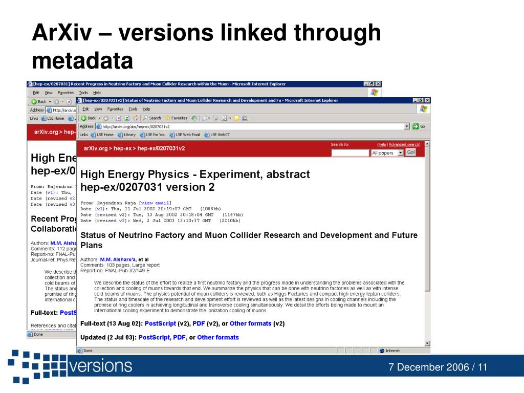 Versions of journal articles : recent initiatives Frances Shipsey, VERSIONS Project Discovery and Access : Standards and the Information Chain (JISC, ALPSP, Publishers Association, CrossRef) Bonhill House, London, 7 December 2006. Four recent initiatives on versioning.