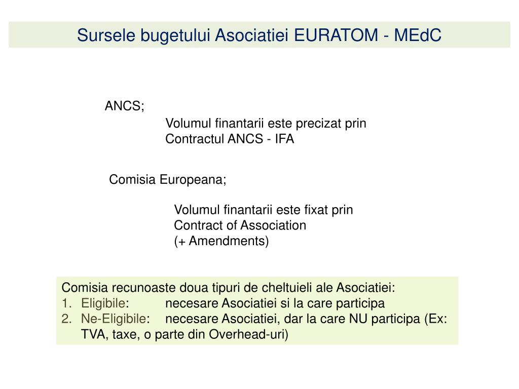 SurselebugetuluiAsociatiei EURATOM - MEdC ANCS; Volumul finantarii este precizat prin Contractul ANCS - IFA Comisia Europeana; Volumul finantarii este fixat prin Contract of Association (+ Amendments) • Comisiarecunoastedouatipuri de cheltuieli ale Asociatiei: • Eligibile: necesareAsociatieisi la care participa • Ne-Eligibile: necesareAsociatiei, dar la care NU participa (Ex: TVA, taxe, o parte din Overhead-uri)