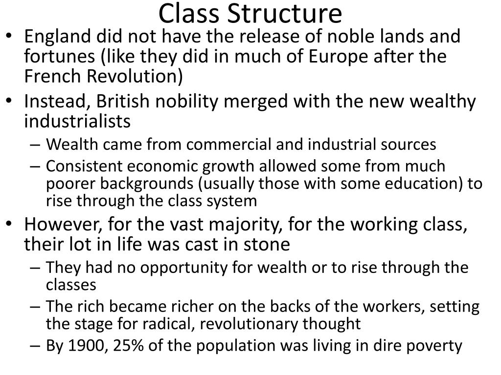 Class Structure • England did not have the release of noble lands and fortunes (like they did in much of Europe after the French Revolution) • Instead, British nobility merged with the new wealthy industrialists • Wealth came from commercial and industrial sources • Consistent economic growth allowed some from much poorer backgrounds (usually those with some education) to rise through the class system • However, for the vast majority, for the working class, their lot in life was cast in stone • They had no opportunity for wealth or to rise through the classes • The rich became richer on the backs of the workers, setting the stage for radical, revolutionary thought • By 1900, 25% of the population was living in dire poverty