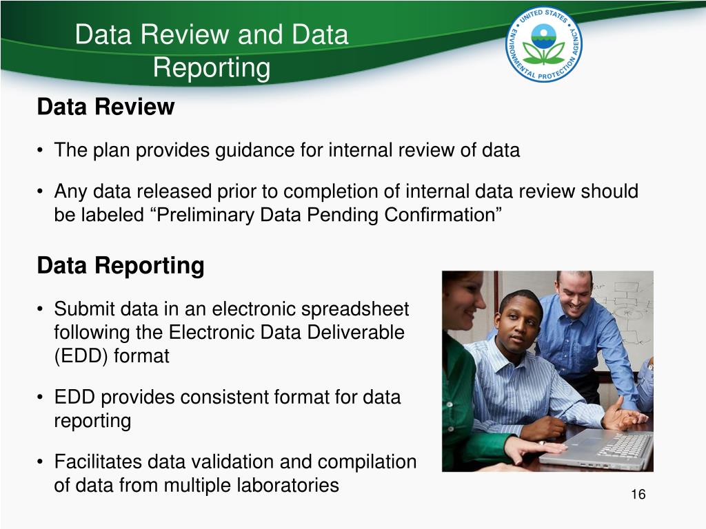 Data Review and Data Reporting Data Review • The plan provides guidance for internal review of data • Any data released prior to completion of internal data review should be labeled “Preliminary Data Pending Confirmation” Data Reporting • Submit data in an electronic spreadsheet following the Electronic Data Deliverable (EDD) format • EDD provides consistent format for data reporting • Facilitates data validation and compilation of data from multiple laboratories
