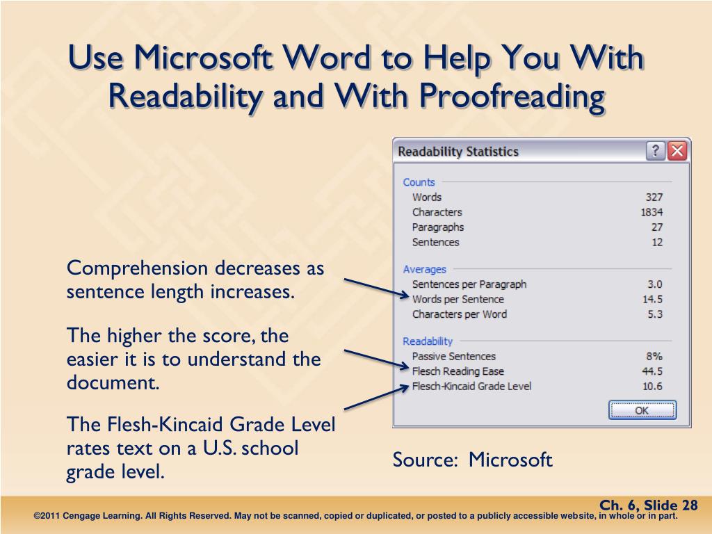Use Microsoft Word to Help You With Readability and With Proofreading Comprehension decreases as sentence length increases. The higher the score, the easier it is to understand the document. The Flesh-Kincaid Grade Level rates text on a U.S. school grade level. Source: Microsoft