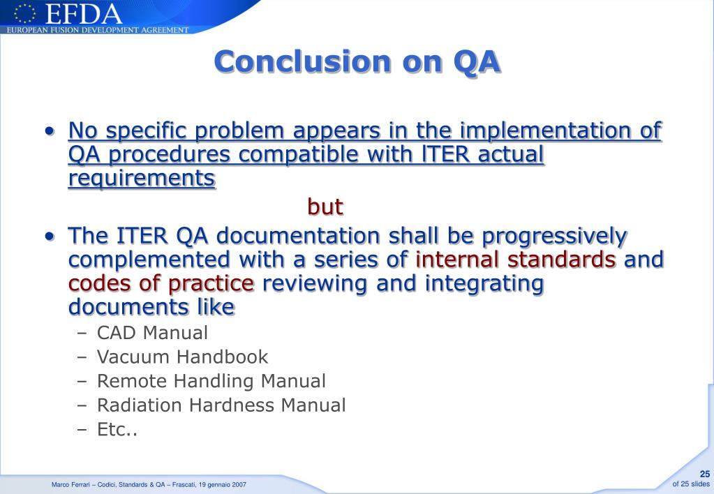 Conclusion on QA • No specific problem appears in the implementation of QA procedures compatible with lTER actual requirements but • The ITER QA documentation shall be progressively complemented with a series of internal standards and codes of practice reviewing and integrating documents like • CAD Manual • Vacuum Handbook • Remote Handling Manual • Radiation Hardness Manual • Etc.. Marco Ferrari – Codici, Standards & QA – Frascati, 19 gennaio 2007