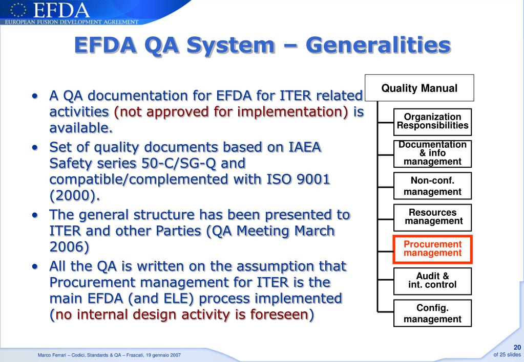 Quality Manual Organization Responsibilities Documentation & info management Non-conf. management Resources management Procurement management Audit & int. control Config. management EFDA QA System – Generalities • A QA documentation for EFDA for ITER related activities (not approved for implementation) is available. • Set of quality documents based on IAEA Safety series 50-C/SG-Q and compatible/complemented with ISO 9001 (2000). • The general structure has been presented to ITER and other Parties (QA Meeting March 2006) • All the QA is written on the assumption that Procurement management for ITER is the main EFDA (and ELE) process implemented (no internal design activity is foreseen) Marco Ferrari – Codici, Standards & QA – Frascati, 19 gennaio 2007