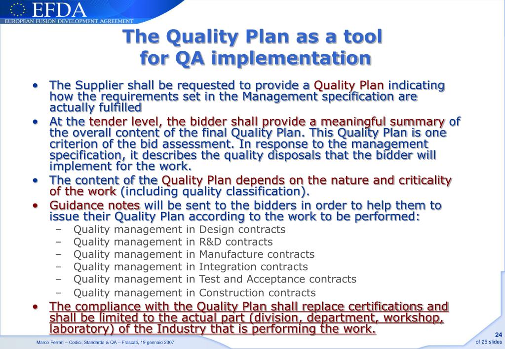 Management Specification • Introduction • Subject • Reference and applicable documents • Management requirements • Responsibilities requirements • The bidder shall identify the different organizations involved to perform the contract and detail the breakdown of responsibilities. • Project management • Frequency and location of the progress meetings • Content and frequency of the progress report • Work plan • Sequences of the work, milestones, key points, reviews, • Work Breakdown Structure (WBS) • Resources requirements • Specific training for personnel • Specific qualification for particular operations • Non-conformance requirements • Transfer to EFDA non-conformance report before any actions for all major non-conformances • Communicate to EFDA the list of all the non-conformances and the associated actions on a regular basis • Change and configuration requirements • Ensure changes are approved by EFDA before any implementation. • Time schedule requirements • Information and documentation requirements • Language to use • List of the documents and records to be issued and controlled • Risk management • Preliminary risk analysis • Procurement requirements • Evidence of effectiveness of the subcontractor quality system • EFDA approval of the proposed suppliers or subcontractors • Assessment and validation requirements • Signature and dating of progress reports for each completed operation • Issue and up-dating of a conformity matrix • Acceptance and delivery requirements • Review of the documentation (Acceptance Data Package) to be provided • Provide a formal Contractor Release Note This document outlines all the quality requirements of the design process management. The purpose is to ensure that all personnel involved in the procurement process use the same management rules and to allow the EFDA Work Package Manager to monitor properly the contract. Marco Ferrari – Codici, Standards & QA – Frascati, 19 gennaio 2007