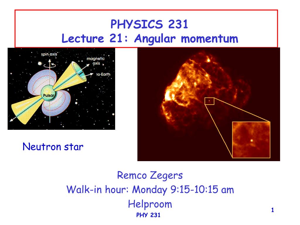 PHYSICS 231Lecture 21: Angular momentum Remco Zegers Walk-in hour: Monday 9:15-10:15 am Helproom Neutron star PHY 231