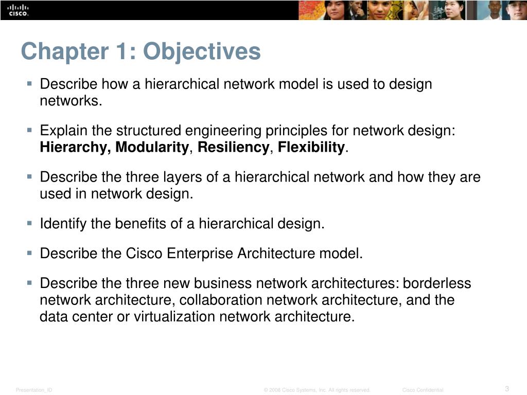 Chapter 1: Objectives • Describe how a hierarchical network model is used to design networks. • Explain the structured engineering principles for network design: Hierarchy, Modularity, Resiliency, Flexibility. • Describe the three layers of a hierarchical network and how they are used in network design. • Identify the benefits of a hierarchical design. • Describe the Cisco Enterprise Architecture model. • Describe the three new business network architectures: borderless network architecture, collaboration network architecture, and the data center or virtualization network architecture.