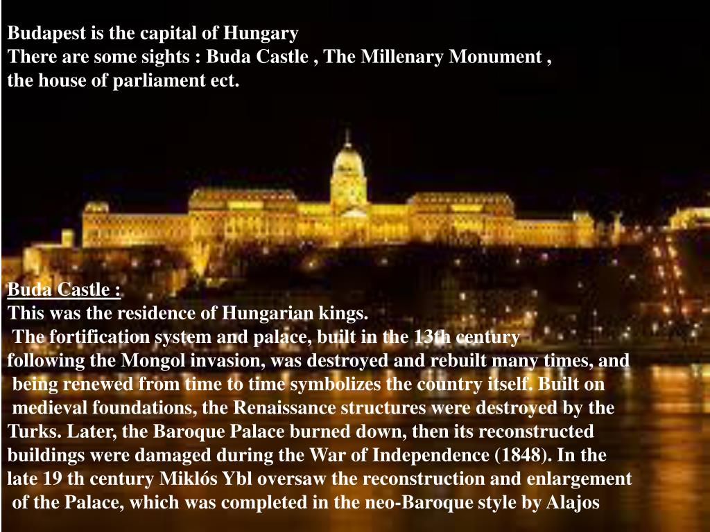 Budapest is the capital of Hungary There are some sights : Buda Castle , The Millenary Monument , the house of parliament ect. Buda Castle : This was the residence of Hungarian kings. The fortification system and palace, built in the 13th century following the Mongol invasion, was destroyed and rebuilt many times, and being renewed from time to time symbolizes the country itself. Built on medieval foundations, the Renaissance structures were destroyed by the Turks. Later, the Baroque Palace burned down, then its reconstructed buildings were damaged during the War of Independence (1848). In the late 19 th century Miklós Ybl oversaw the reconstruction and enlargement of the Palace, which was completed in the neo-Baroque style by Alajos