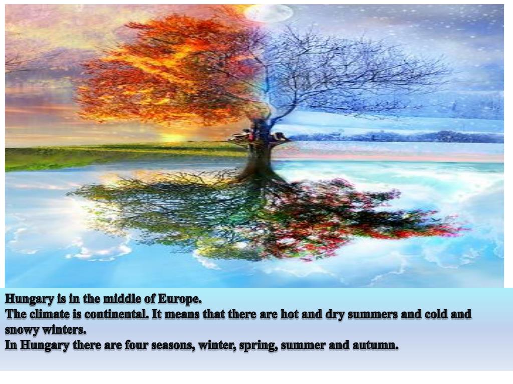 Hungary is in the middle of Europe. The climate is continental. It means that there are hot and dry summers and cold and snowy winters. In Hungary there are four seasons, winter, spring, summer and autumn.