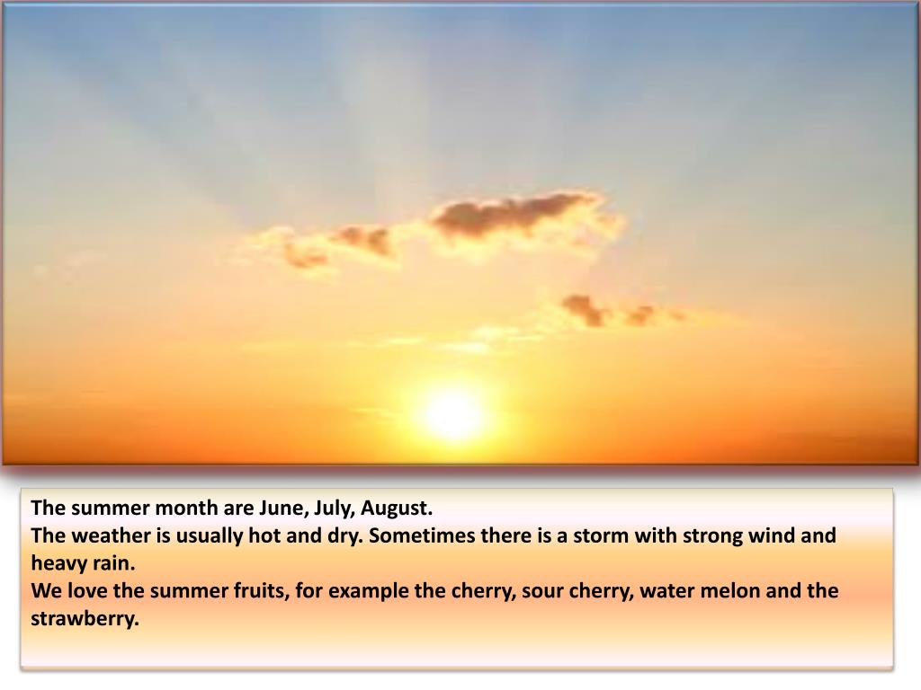 The summer month are June, July, August. The weather is usually hot and dry. Sometimes there is a storm with strong wind and heavy rain. We love the summer fruits, for example the cherry, sour cherry, water melon and the strawberry.