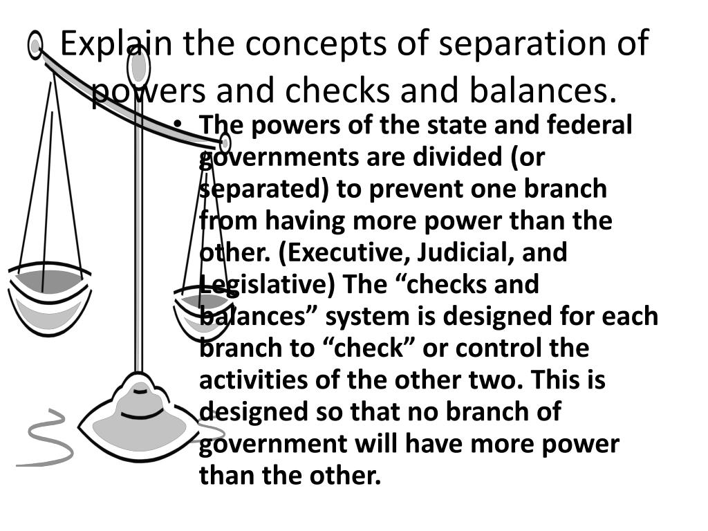 Explain the concepts of separation of powers and checks and balances. • The powers of the state and federal governments are divided (or separated) to prevent one branch from having more power than the other. (Executive, Judicial, and Legislative) The “checks and balances” system is designed for each branch to “check” or control the activities of the other two. This is designed so that no branch of government will have more power than the other.