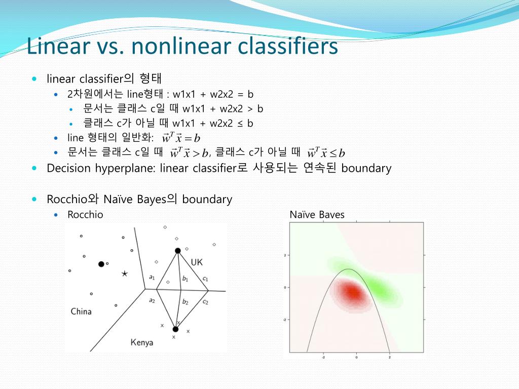 Linear vs. nonlinear classifiers • linear classifier의 형태 • 2차원에서는 line형태 : w1x1 + w2x2 = b • 문서는 클래스 c일 때 w1x1 + w2x2 > b • 클래스 c가 아닐 때 w1x1 + w2x2 ≤ b • line 형태의 일반화: • 문서는 클래스 c일 때 , 클래스 c가 아닐 때 • Decision hyperplane: linear classifier로 사용되는 연속된 boundary • Rocchio와 Naïve Bayes의 boundary • Rocchio Naïve Bayes