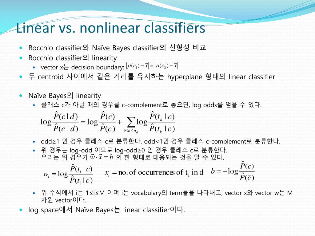 Linear vs. nonlinear classifiers • Rocchio classifier와 Naïve Bayes classifier의 선형성 비교 • Rocchio classifier의 linearity • vector x는 decision boundary: • 두 centroid 사이에서 같은 거리를 유지하는 hyperplane 형태의 linear classifier • Naïve Bayes의 linearity • 클래스 c가 아닐 때의 경우를 c-complement로 놓으면, log odds를 얻을 수 있다. • odd≥1 인 경우 클래스 c로 분류한다. odd<1인 경우 클래스 c-complement로 분류한다. • 위 경우는 log-odd 이므로 log-odd≥0 인 경우클래스 c로 분류한다.우리는 위 경우가 의 한 형태로 대응되는 것을 알 수 있다. • 위 수식에서 i는 1≤i≤M 이며 i는 vocabulary의 term들을 나타내고, vector x와 vector w는 M차원 vector이다. • log space에서 Naïve Bayes는 linear classifier이다.