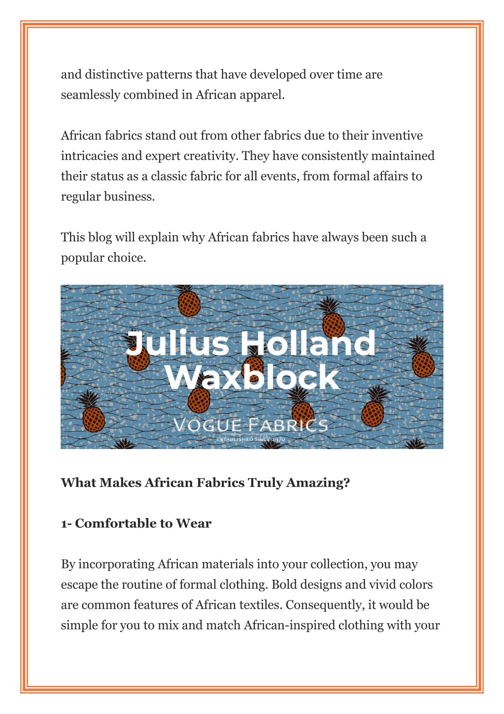 and distinctive patterns that have developed over time are seamlessly combined in African apparel. African fabrics stand out from other fabrics due to their inventive intricacies and expert creativity. They have consistently maintained their status as a classic fabric for all events, from formal affairs to regular business. This blog will explain why African fabrics have always been such a popular choice. What Makes African Fabrics Truly Amazing? 1- Comfortable to Wear By incorporating African materials into your collection, you may escape the routine of formal clothing. Bold designs and vivid colors are common features of African textiles. Consequently, it would be simple for you to mix and match African-inspired clothing with your