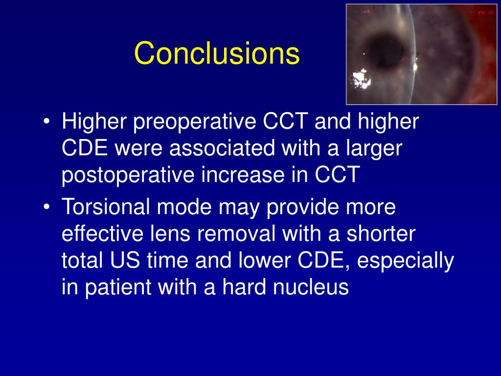 Conclusions • Higher preoperative CCT and higher CDE were associated with a larger postoperative increase in CCT • Torsional mode may provide more effective lens removal with a shorter total US time and lower CDE, especially in patient with a hard nucleus