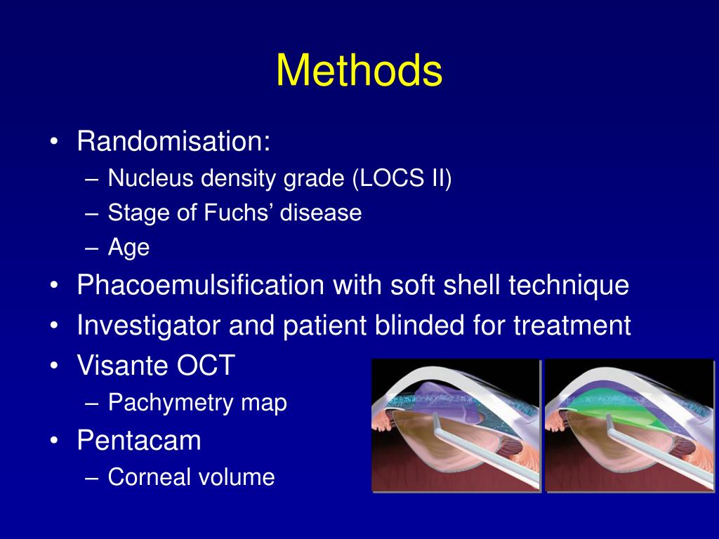 Methods • Randomisation: • Nucleus density grade (LOCS II) • Stage of Fuchs’ disease • Age • Phacoemulsification with soft shell technique • Investigator and patient blinded for treatment • Visante OCT • Pachymetry map • Pentacam • Corneal volume
