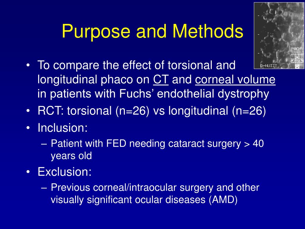 Purpose and Methods • To compare the effect of torsional and longitudinal phaco on CT and corneal volume in patients with Fuchs’ endothelial dystrophy • RCT: torsional (n=26) vs longitudinal (n=26) • Inclusion: • Patient with FED needing cataract surgery > 40 years old • Exclusion: • Previous corneal/intraocular surgery and other visually significant ocular diseases (AMD)