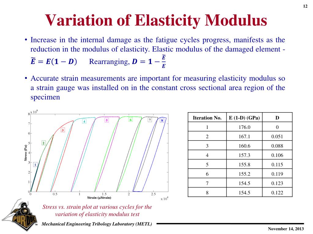 Variation of Elasticity Modulus • Increase in the internal damage as the fatigue cycles progress, manifests as the reduction in the modulus of elasticity. Elastic modulus of the damaged element - Rearranging, • Accurate strain measurements are important for measuring elasticity modulus so a strain gauge was installed on in the constant cross sectional area region of the specimen Stress vs. strain plot at various cycles for the variation of elasticity modulus test