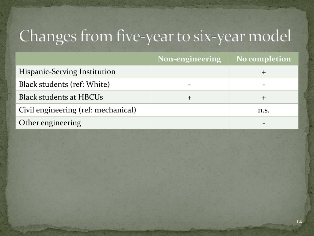 Variables • Dependent Variable (measured five years after college entry): • Engineering completion compared to: • Bachelor’s completion in non-engineering field • No bachelor’s degree completion-includes students still enrolled (major not known)
