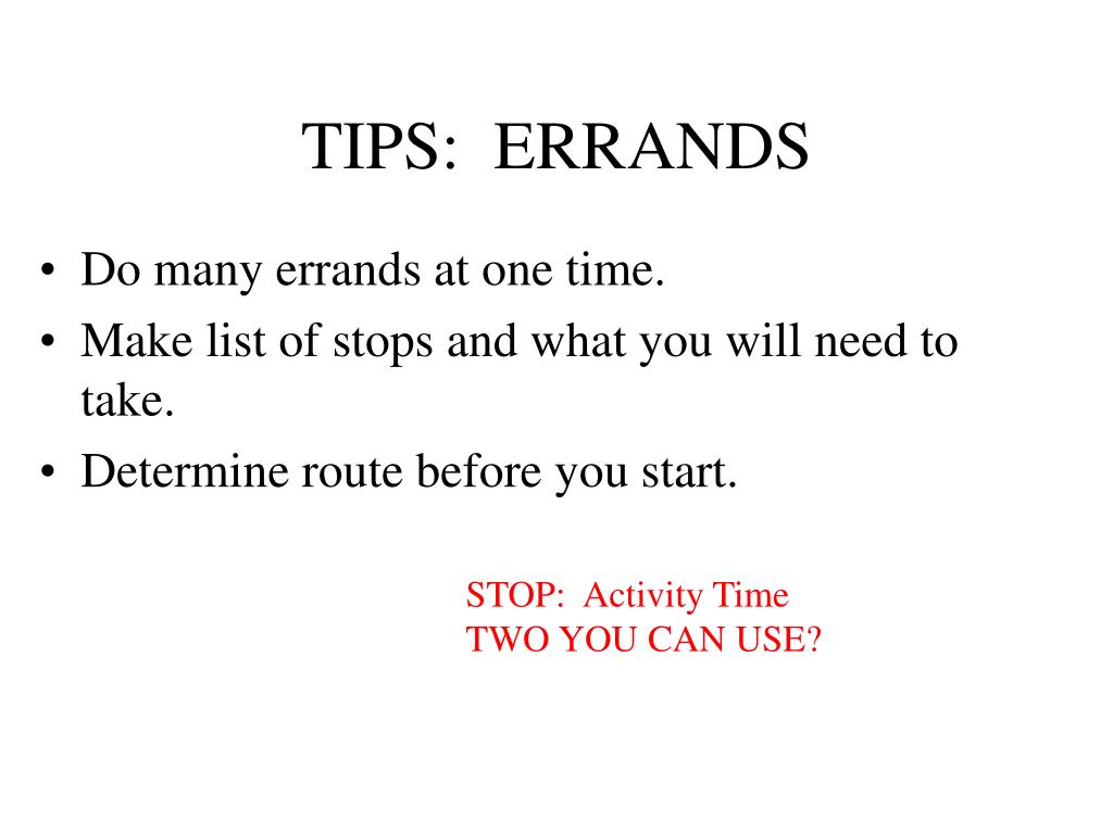 TIPS: ERRANDS • Do many errands at one time. • Make list of stops and what you will need to take. • Determine route before you start. STOP: Activity Time TWO YOU CAN USE?