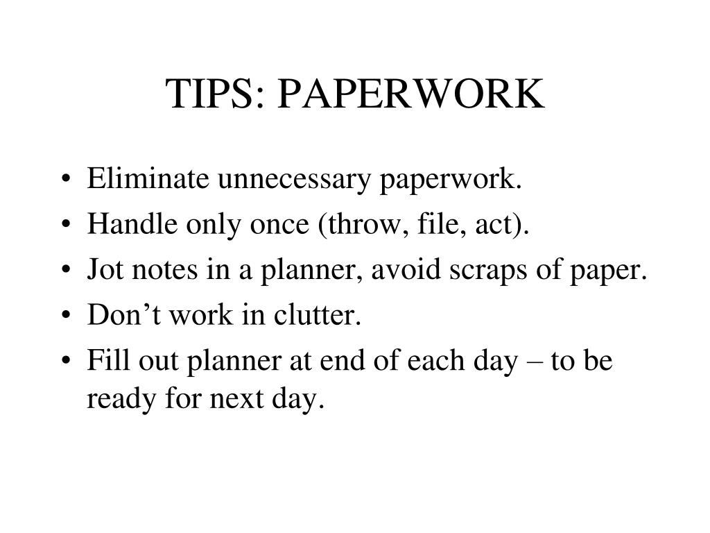 TIPS: PAPERWORK • Eliminate unnecessary paperwork. • Handle only once (throw, file, act). • Jot notes in a planner, avoid scraps of paper. • Don’t work in clutter. • Fill out planner at end of each day – to be ready for next day.
