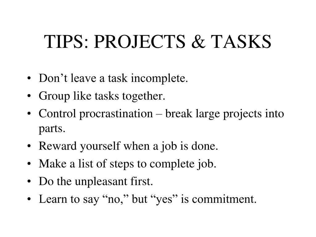 TIPS: PROJECTS & TASKS • Don’t leave a task incomplete. • Group like tasks together. • Control procrastination – break large projects into parts. • Reward yourself when a job is done. • Make a list of steps to complete job. • Do the unpleasant first. • Learn to say “no,” but “yes” is commitment.