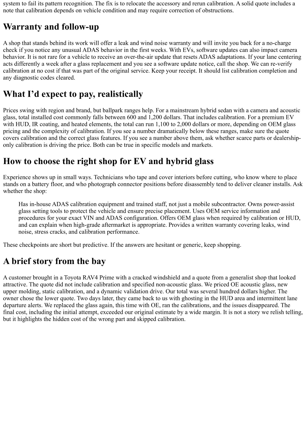 system to fail its pattern recognition. The fix is to relocate the accessory and rerun calibration. A solid quote includes a note that calibration depends on vehicle condition and may require correction of obstructions. Warranty and follow-up A shop that stands behind its work will offer a leak and wind noise warranty and will invite you back for a no-charge check if you notice any unusual ADAS behavior in the first weeks. With EVs, software updates can also impact camera behavior. It is not rare for a vehicle to receive an over-the-air update that resets ADAS adaptations. If your lane centering acts differently a week after a glass replacement and you see a software update notice, call the shop. We can re-verify calibration at no cost if that was part of the original service. Keep your receipt. It should list calibration completion and any diagnostic codes cleared. What I’d expect to pay, realistically Prices swing with region and brand, but ballpark ranges help. For a mainstream hybrid sedan with a camera and acoustic glass, total installed cost commonly falls between 600 and 1,200 dollars. That includes calibration. For a premium EV with HUD, IR coating, and heated elements, the total can run 1,100 to 2,000 dollars or more, depending on OEM glass pricing and the complexity of calibration. If you see a number dramatically below these ranges, make sure the quote covers calibration and the correct glass features. If you see a number above them, ask whether scarce parts or dealership- only calibration is driving the price. Both can be true in specific models and markets. How to choose the right shop for EV and hybrid glass Experience shows up in small ways. Technicians who tape and cover interiors before cutting, who know where to place stands on a battery floor, and who photograph connector positions before disassembly tend to deliver cleaner installs. Ask whether the shop: Has in-house ADAS calibration equipment and trained staff, not just a mobile subcontractor. Owns power-assist glass setting tools to protect the vehicle and ensure precise placement. Uses OEM service information and procedures for your exact VIN and ADAS configuration. Offers OEM glass when required by calibration or HUD, and can explain when high-grade aftermarket is appropriate. Provides a written warranty covering leaks, wind noise, stress cracks, and calibration performance. These checkpoints are short but predictive. If the answers are hesitant or generic, keep shopping. A brief story from the bay A customer brought in a Toyota RAV4 Prime with a cracked windshield and a quote from a generalist shop that looked attractive. The quote did not include calibration and specified non-acoustic glass. We priced OE acoustic glass, new upper molding, static calibration, and a dynamic validation drive. Our total was several hundred dollars higher. The owner chose the lower quote. Two days later, they came back to us with ghosting in the HUD area and intermittent lane departure alerts. We replaced the glass again, this time with OE, ran the calibrations, and the issues disappeared. The final cost, including the initial attempt, exceeded our original estimate by a wide margin. It is not a story we relish telling, but it highlights the hidden cost of the wrong part and skipped calibration.