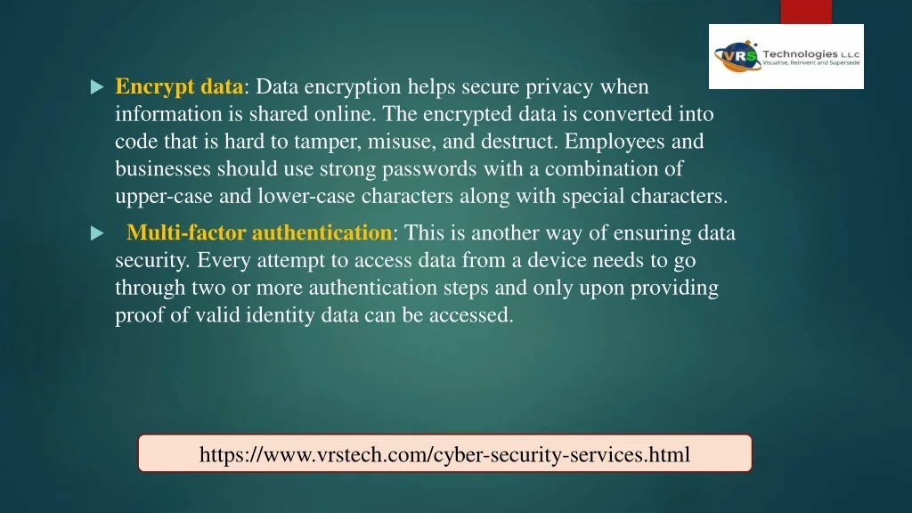 Encrypt data: Data encryption helps secure privacy when information is shared online. The encrypted data is converted into code that is hard to tamper, misuse, and destruct. Employees and businesses should use strong passwords with a combination of upper-case and lower-case characters along with special characters. Multi-factor authentication: This is another way of ensuring data security. Every attempt to access data from a device needs to go through two or more authentication steps and only upon providing proof of valid identity data can be accessed. https://www.vrstech.com/cyber-security-services.html