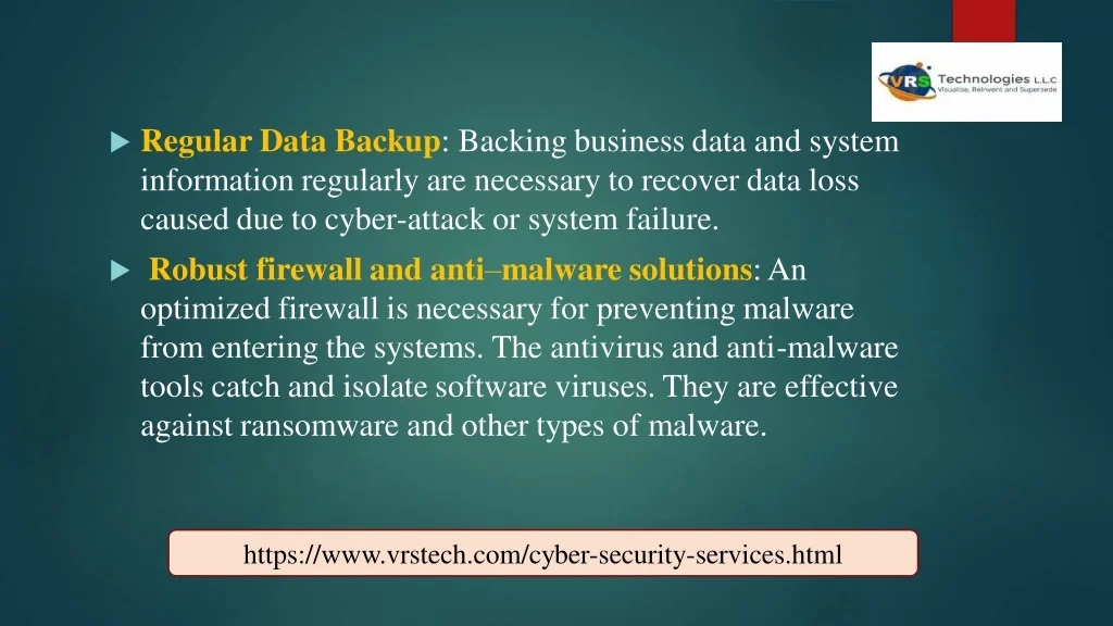 Regular Data Backup: Backing business data and system information regularly are necessary to recover data loss caused due to cyber-attack or system failure. Robust firewall and anti–malware solutions: An optimized firewall is necessary for preventing malware from entering the systems. The antivirus and anti-malware tools catch and isolate software viruses. They are effective against ransomware and other types of malware. https://www.vrstech.com/cyber-security-services.html