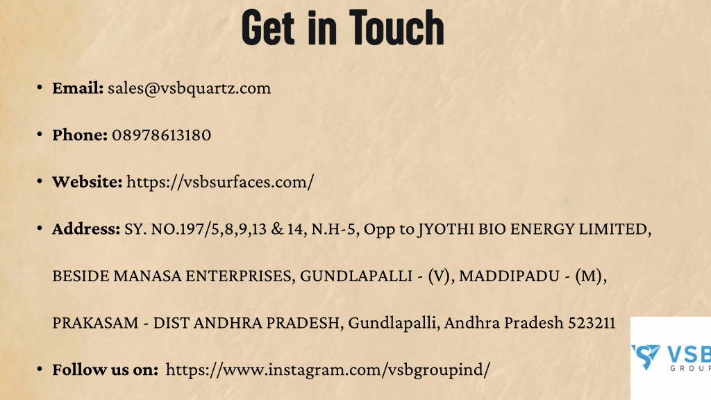 • Email: sales@vsbquartz.com • Phone:08978613180 • Website:https://vsbsurfaces.com/ • Address: SY. NO.197/5,8,9,13 & 14, N.H-5, Opp to JYOTHI BIO ENERGY LIMITED, BESIDE MANASA ENTERPRISES, GUNDLAPALLI -(V), MADDIPADU -(M), PRAKASAM -DIST ANDHRA PRADESH, Gundlapalli, Andhra Pradesh 523211 • Follow us on: https://www.instagram.com/vsbgroupind/