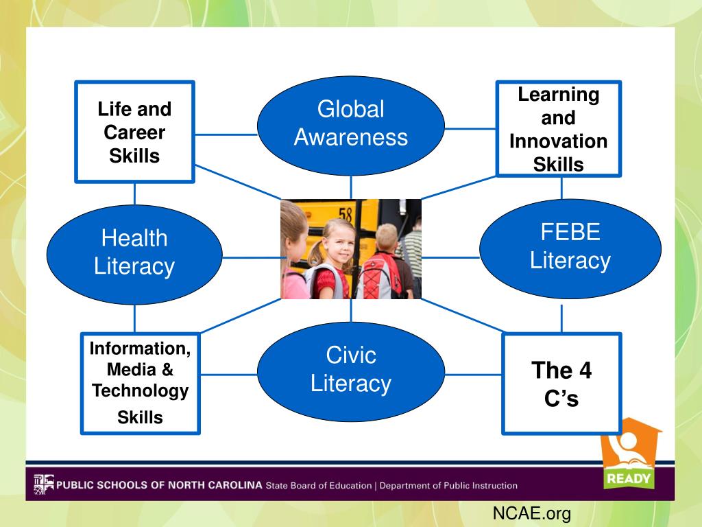 Global Awareness Life and Career Skills Learning and Innovation Skills FEBE Literacy Health Literacy Civic Literacy Information, Media & Technology Skills The 4 C’s NCAE.org