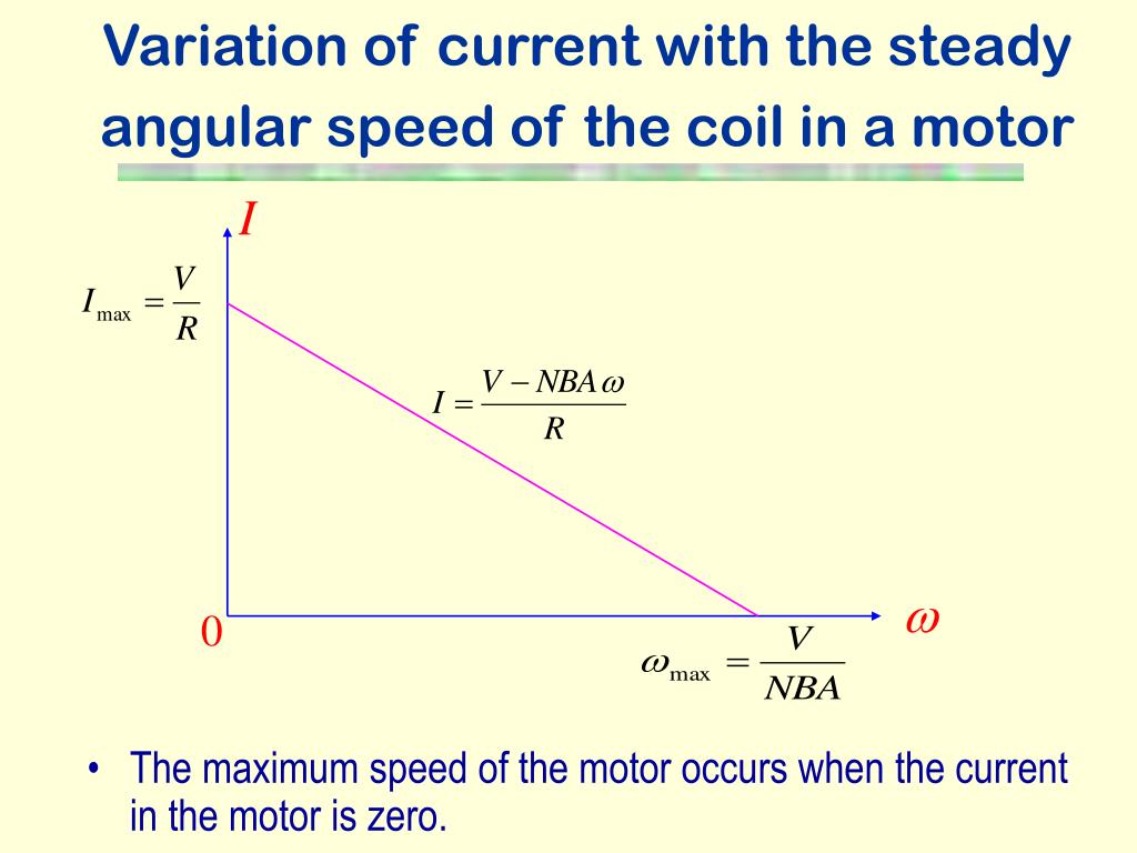 I 0 Variation of current with the steady angular speed of the coil in a motor • The maximum speed of the motor occurs when the current in the motor is zero.