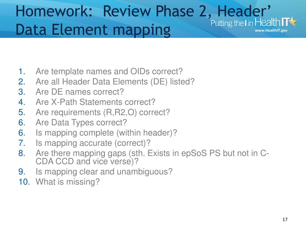 Homework: Review Phase 2, Header’ Data Element mapping • Are template names and OIDs correct? • Are all Header Data Elements (DE) listed? • Are DE names correct? • Are X-Path Statements correct? • Are requirements (R,R2,O) correct? • Are Data Types correct? • Is mapping complete (within header)? • Is mapping accurate (correct)? • Are there mapping gaps (sth. Exists in epSoS PS but not in C-CDA CCD and vice verse)? • Is mapping clear and unambiguous? • What is missing?