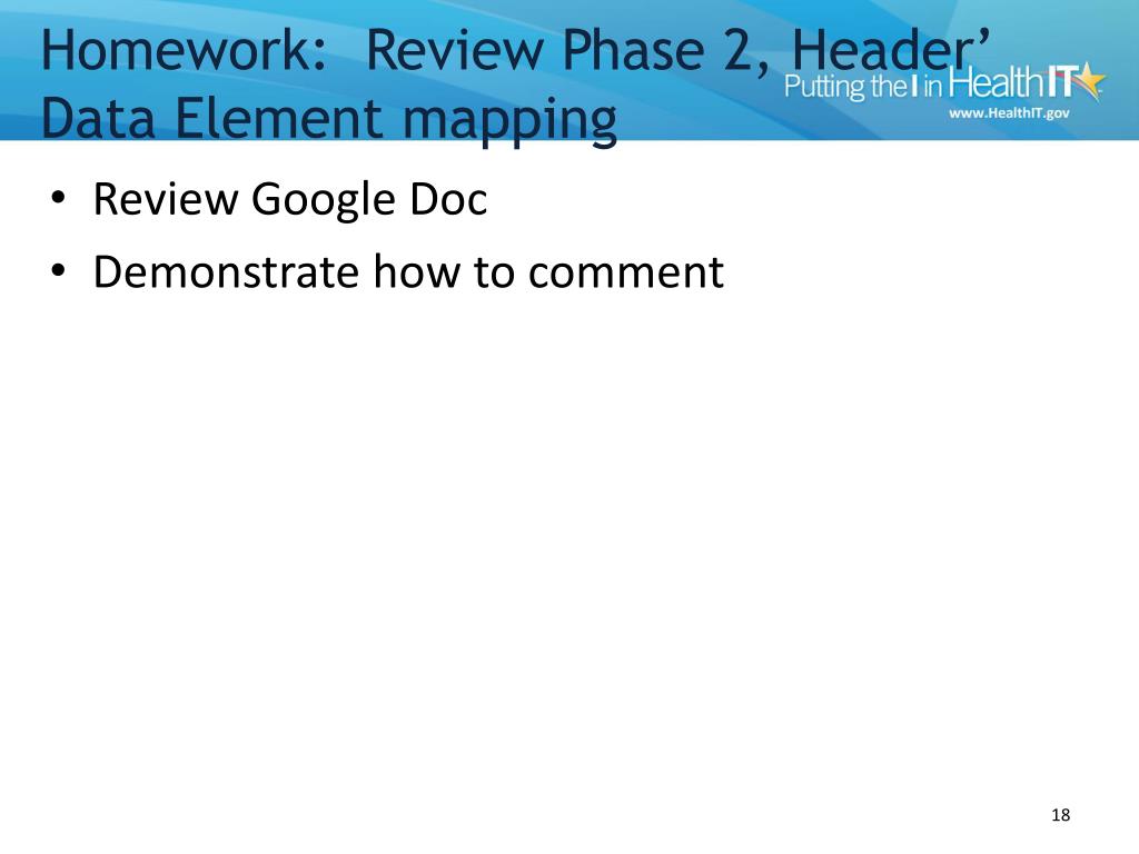 Homework: Review Phase 2, Header’ Data Element mapping • Review Google Doc • Demonstrate how to comment