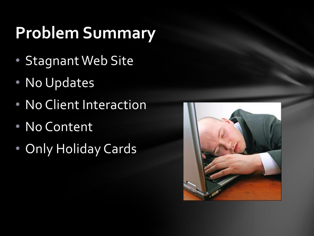 Problem Summary • Stagnant Web Site • No Updates • No Client Interaction • No Content • Only Holiday Cards