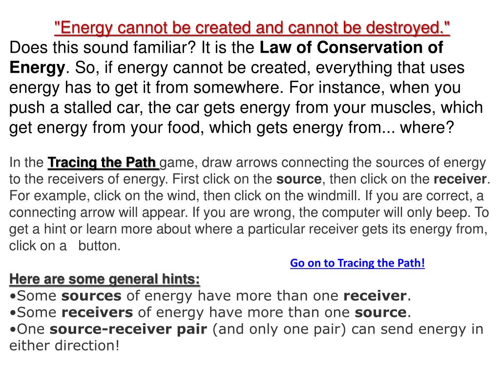 "Energy cannot be created and cannot be destroyed." Does this sound familiar? It is the Law of Conservation of Energy. So, if energy cannot be created, everything that uses energy has to get it from somewhere. For instance, when you push a stalled car, the car gets energy from your muscles, which get energy from your food, which gets energy from... where? In the Tracing the Pathgame, draw arrows connecting the sources of energy to the receivers of energy. First click on the source, then click on the receiver. For example, click on the wind, then click on the windmill. If you are correct, a connecting arrow will appear. If you are wrong, the computer will only beep. To get a hint or learn more about where a particular receiver gets its energy from, click on a button. Here are some general hints: • Some sources of energy have more than one receiver. • Some receivers of energy have more than one source. • One source-receiver pair (and only one pair) can send energy in either direction!