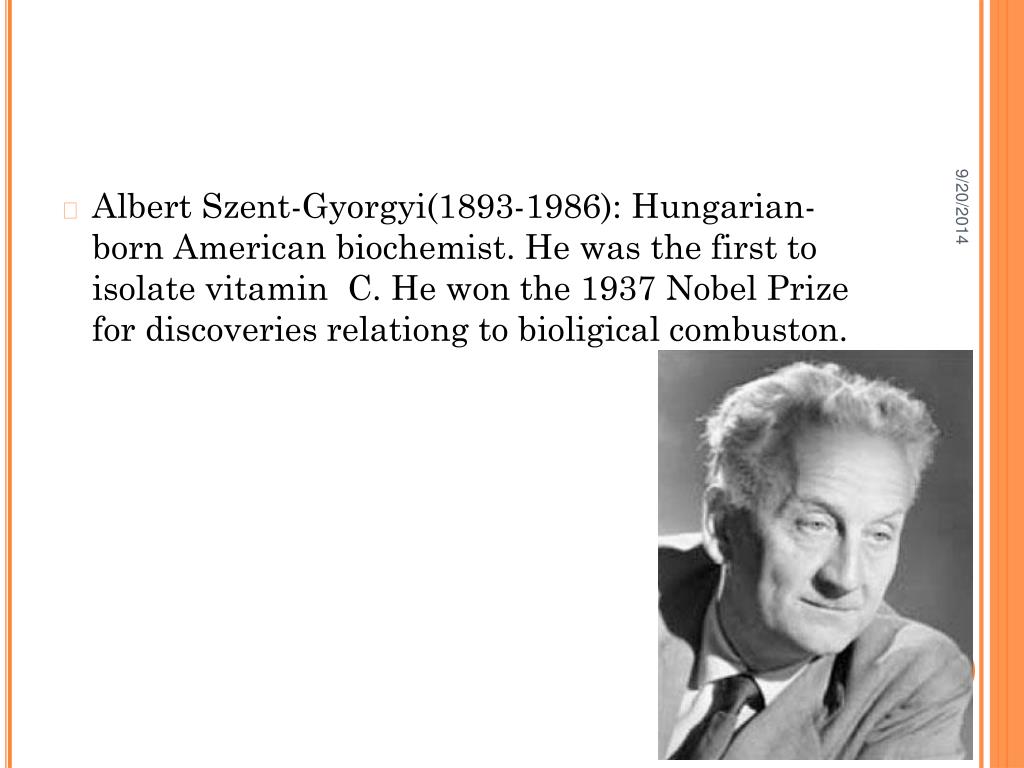 Albert Szent-Gyorgyi(1893-1986): Hungarian-born American biochemist. He was the first to isolate vitamin C. He won the 1937 Nobel Prize for discoveries relationg to bioligical combuston.
