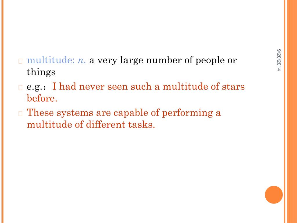 multitude: n.a very large number of people or things • e.g.:I had never seen such a multitude of stars before. • These systems are capable of performing a multitude of different tasks.
